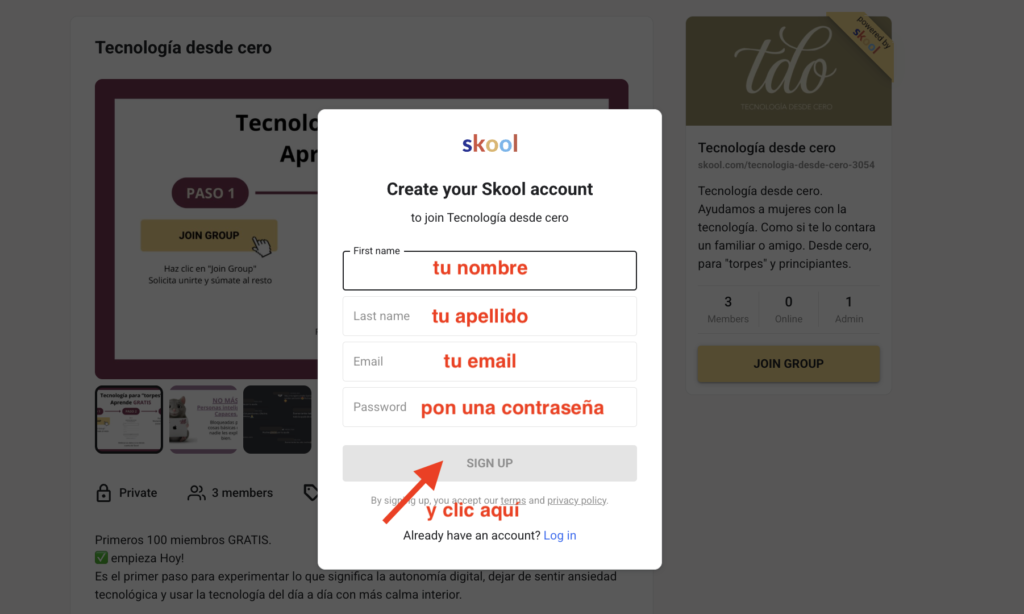 Si todavía no tienes una cuenta de skool, rellena los datos: tu nombre, apellido, email y contraseña. HAZ CLIC EN SIGN UP